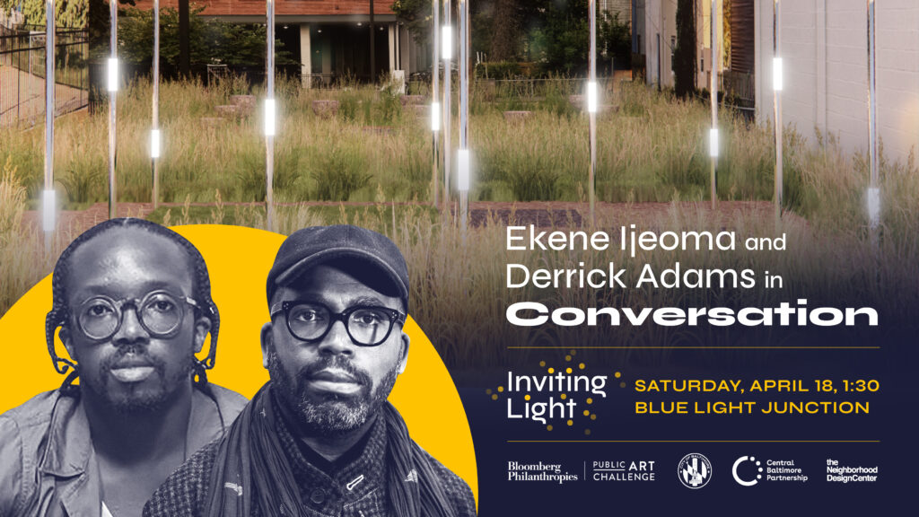 Harmony Park artist Ekene Ijeoma and artist and curator of the Inviting Light site installations, Derrick Adams, will share a public conversation about the project moderated by Maura Dwyer, whose led community engagement for Inviting Light as a Project Coordinator for The Neighborhood Design Center.